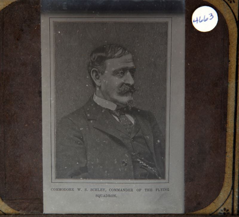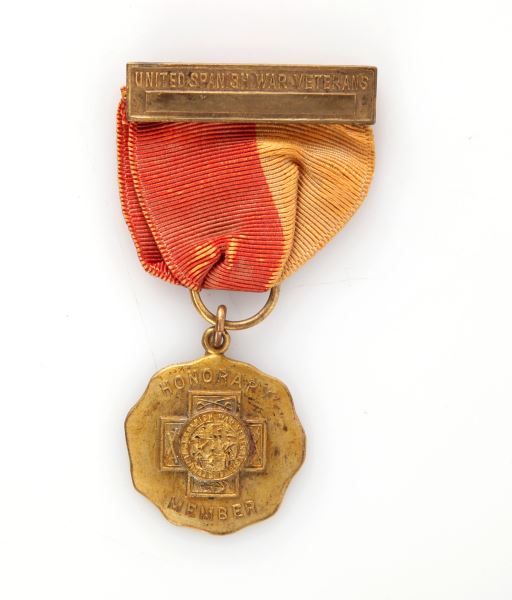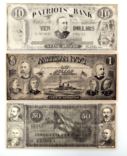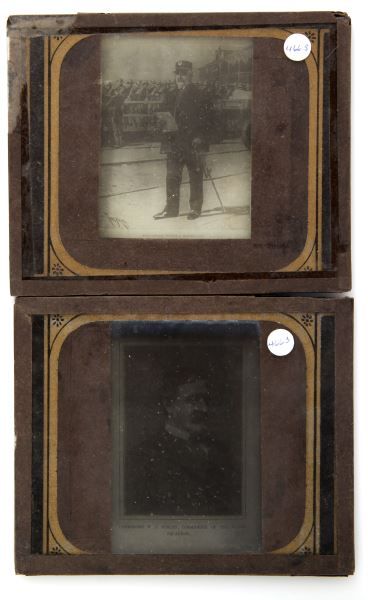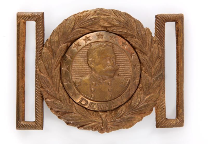 Includes 1899 Dewey sword belt medal-buckle, United Spanish War Veterans medal, three patriotic advertising notes, each VF or better, and two magic lantern frames of Spanish American war Admirals one being Dewey.