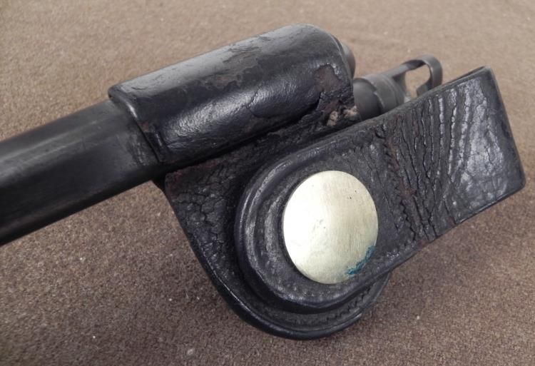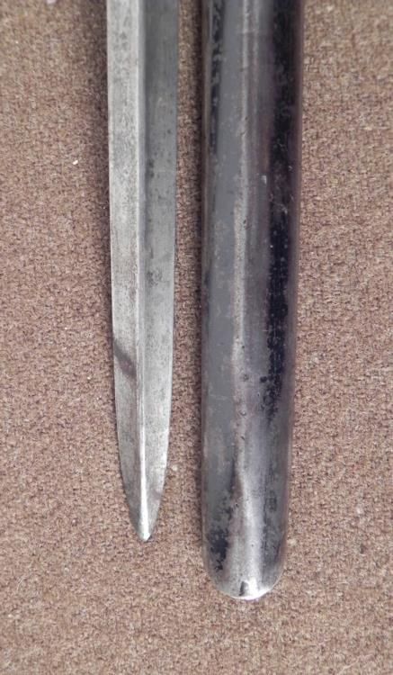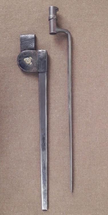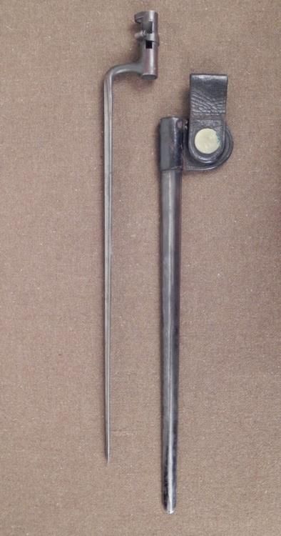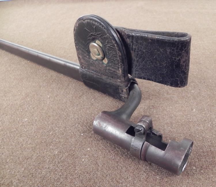 SPANISH-AMERICAN WAR SOCKET BAYONET WITH SCABBARD & FROG-PLAIN DISC * * O/A 22"--BLADE 18" FROM TIP TO BEND--APPROX 7/8" WIDE SOCKET--NICE BLUED SCABBARD--LEATHER FROG NICE-MAKER MARKED ON REVERSE (UNREADABLE)--HAS PLAIN BRASS DISK --LEFT BLANK TO BE MARKED AT UNIT LEVEL *