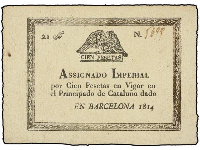 SPANISH BANK NOTES: ANCIENT - 100 Pesetas. 1814. JOSÉ BONAPARTE. ASIGNADO IMPERIAL. BARCELONA. Ed-A15. EBC.