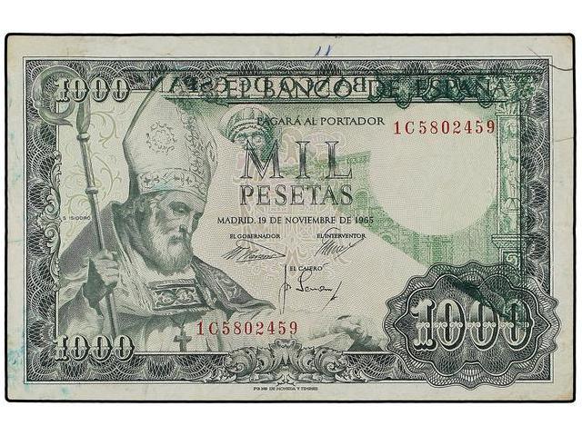 SPANISH BANK NOTES: ESTADO ESPAÑOL - 1.000 Pesetas. 19 Noviembre 1965. San Isidoro. Serie 1C. ERROR: Parte del reverso impreso en anverso. (Corte en margen derecho). Ed-D72a. MBC.