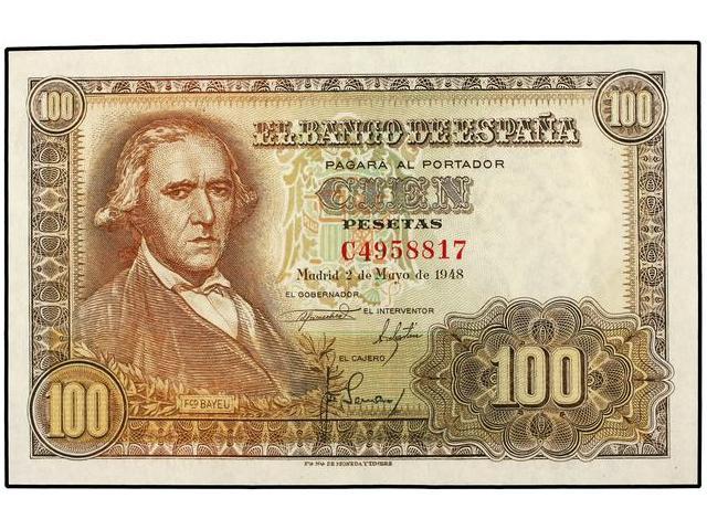 SPANISH BANK NOTES: ESTADO ESPAÑOL - 100 Pesetas. 2 Mayo 1948. Bayeu. Serie C. (Leve doblez en esquina). Ed-D57a. SC.