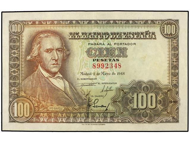 SPANISH BANK NOTES: ESTADO ESPAÑOL - 100 Pesetas. 2 Mayo 1948. Bayeu. Sin Serie. Ed-D57. MBC+.