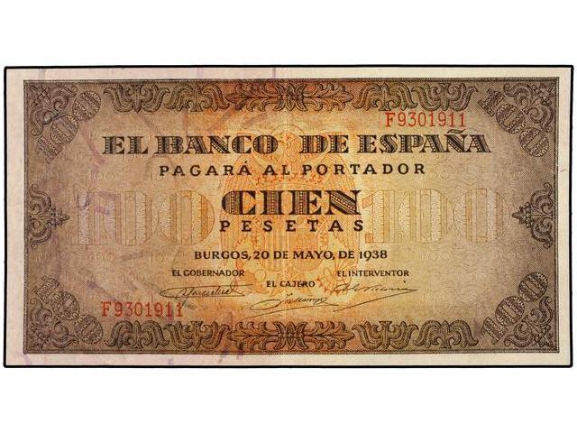 SPANISH BANK NOTES: ESTADO ESPAÑOL - 100 Pesetas. 20 Mayo 1938. Casa del Cordón. Serie F. Ed-D33a. EBC.