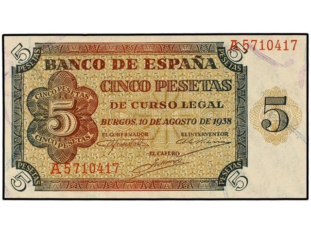 SPANISH BANK NOTES: ESTADO ESPAÑOL - 5 Pesetas. 10 Agosto 1938. Serie A. Ed-D36. SC.