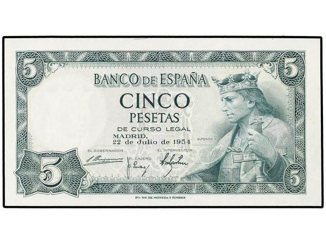 SPANISH BANK NOTES: ESTADO ESPAÑOL - 5 Pesetas. 22 Julio 1954. Alfonso X. Sin Serie. Ed-D67. SC.