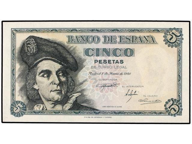 SPANISH BANK NOTES: ESTADO ESPAÑOL - 5 Pesetas. 5 Marzo 1948. Elcano. Serie A. Ed-D56a. SC.