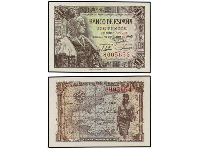 SPANISH BANK NOTES: ESTADO ESPAÑOL - Lote 2 billetes 1 Peseta. 15 Junio 1945. Isabel ´La Católica´. Sin Serie. Pareja correlativa. Ed-D49. SC.