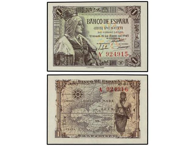 SPANISH BANK NOTES: ESTADO ESPAÑOL - Lote 2 billetes 1 Peseta. 15 Junio 1945. Isabel ´La Católica´. Serie A. Pareja correlativa. Ed-D49a. SC.