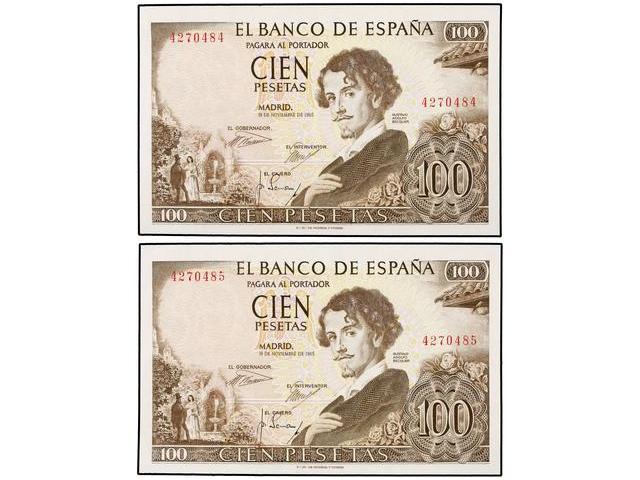 SPANISH BANK NOTES: ESTADO ESPAÑOL - Lote 2 billetes 100 Pesetas. 19 Noviembre 1965. Bécquer. Sin Serie. Pareja correlativa. Ed-D71. EBC+.
