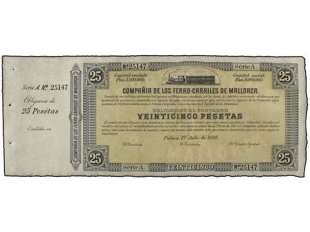 SPANISH BANK NOTES: ESTADO ESPAÑOL - Obligación 25 Pesetas. 1 Julio 1885. COMPAÑIA DE FERRO-CARRILES DE MALLORCA. PALMA DE MALLORCA. Con matriz izquierda. (3 perforaciones de archivo en matriz). SC.
