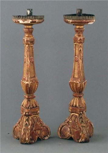 SPANISH BAROQUE CARVED CANDLESTICKS, lacking feet 17th or 18th century