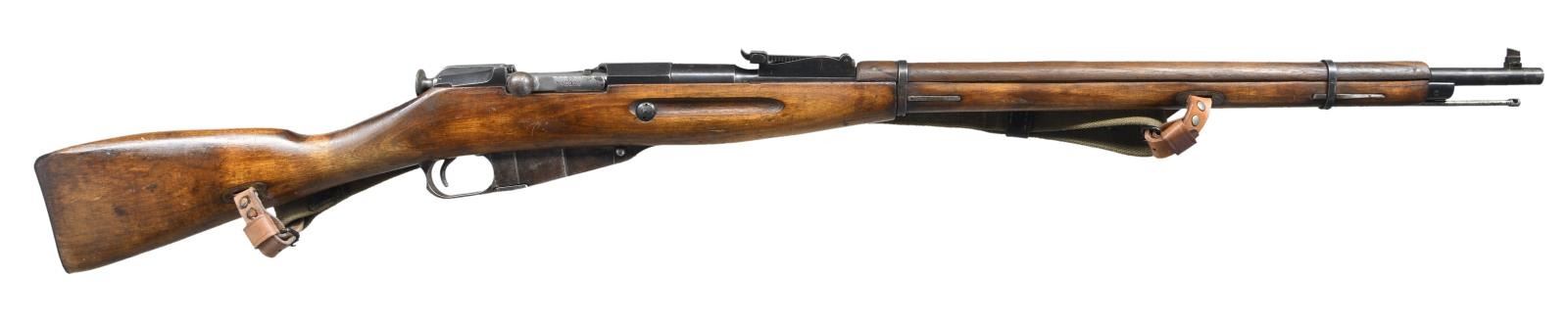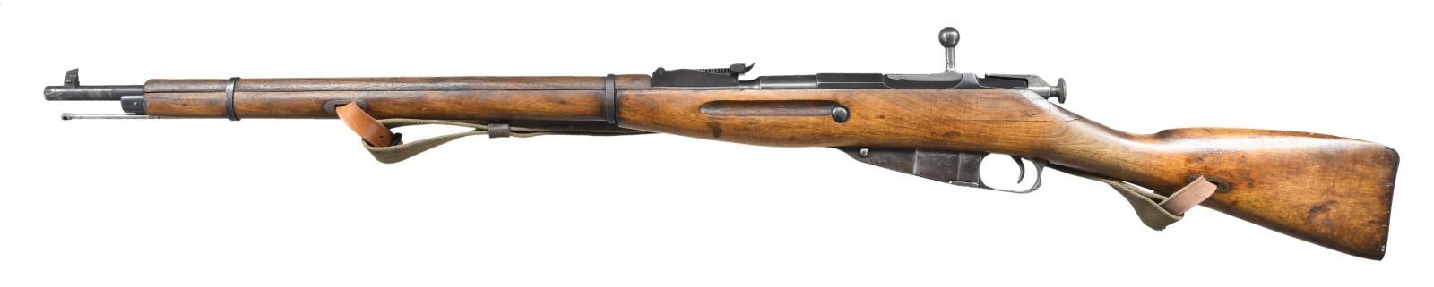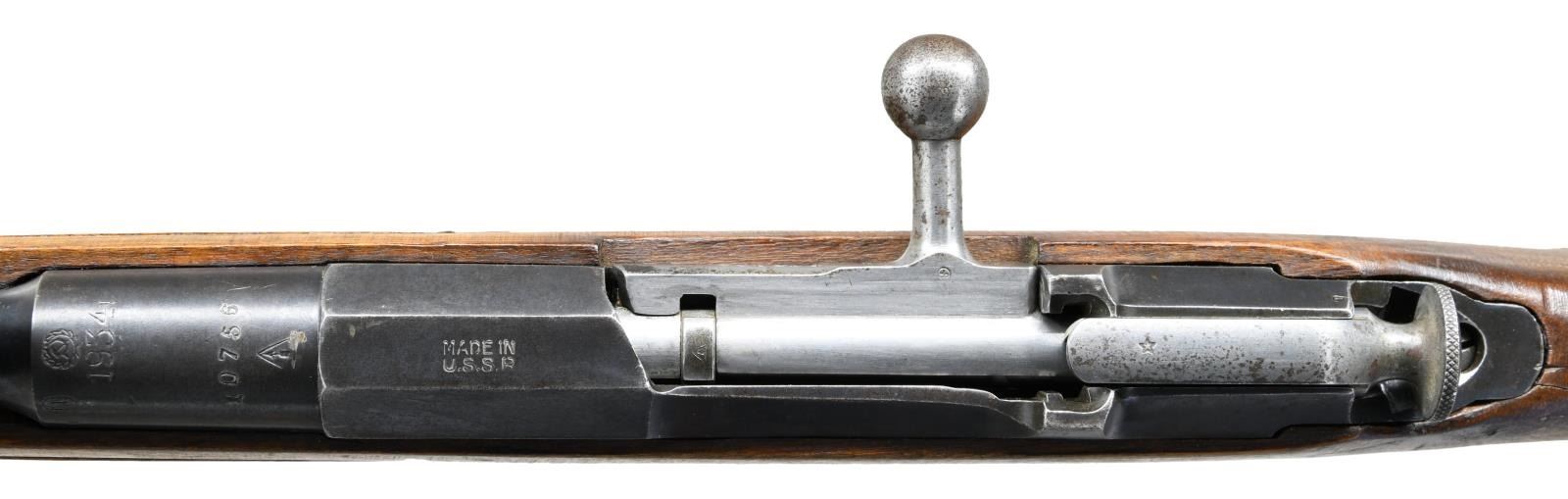 RIFLE. Cal. 7.62x54R. S# 10756. Bbl. 29". Mismatched numbers throughout. Top of bbl. has Izhevsk markings & 1934 date. Top of receiver has "MADE IN U.S.S.R." Spanish Civil War import marking. Tangent rear sight graduated to 2000m. Tall blade front sight w/o hood. Prewar stock w/ sling slots & Spanish made handguard. Com-Bloc style sling & cleaning rod present. CONDITION: arsenal reworked stock set has a few notable cracks on left side including two on left side of action, an 8" crack on handguard, scattered handling wear & dings. Metal retains 50% arsenal blue w/ areas thinning to gray, some pitting & silvering. Worn bore w/ scattered pitting. (23-2040/MJC). CURIO. $300-400.