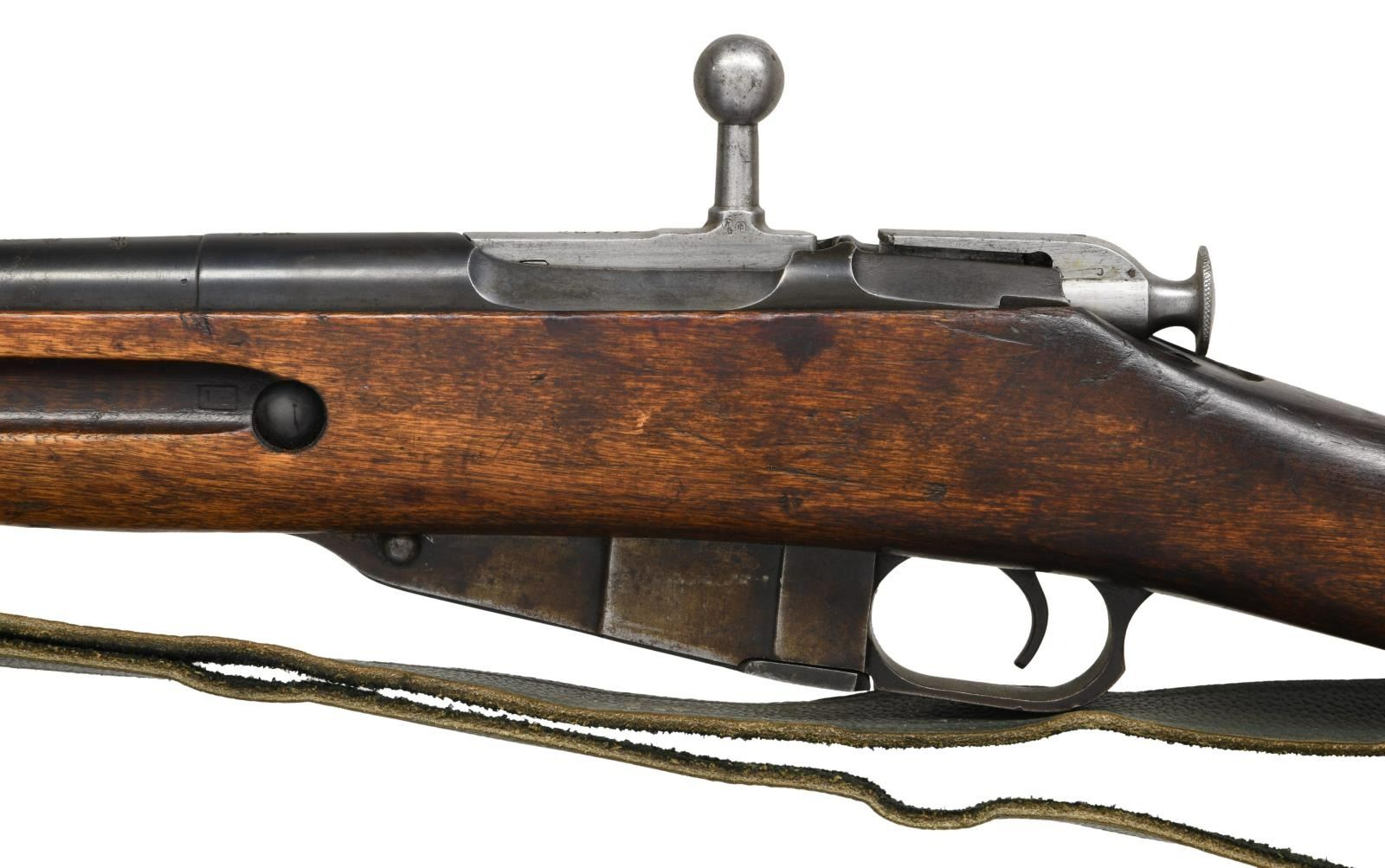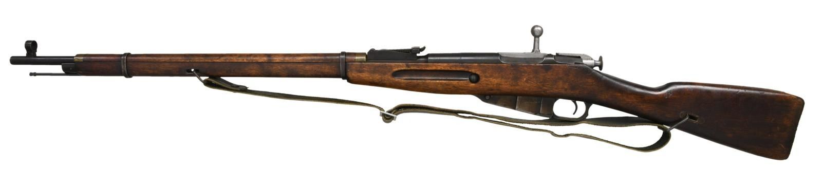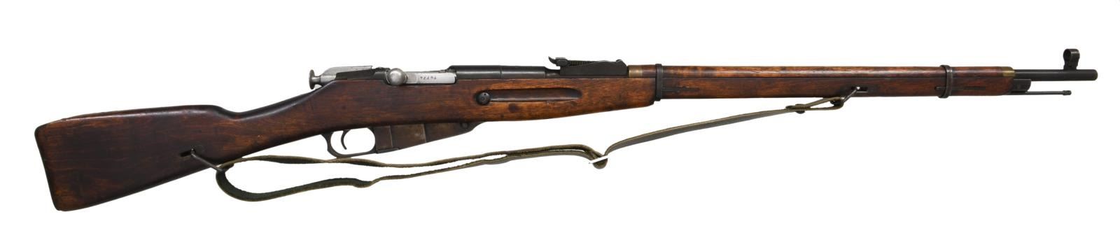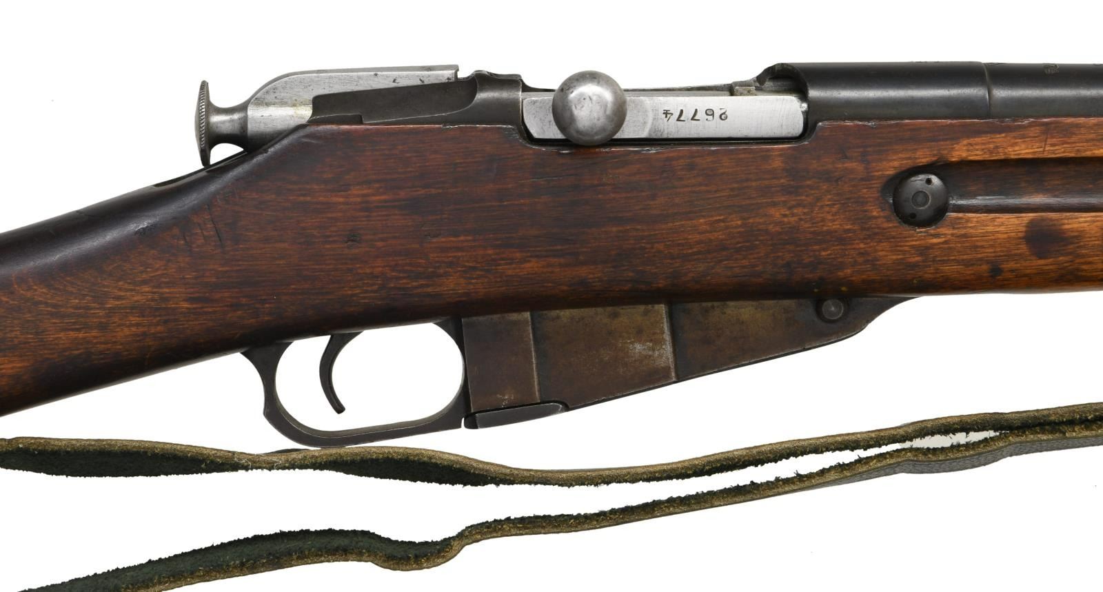 RIFLE. Cal. 7.62x54R. S# 44874. Bbl. 29". Bolt is mismatched but other parts are matching. Top of bbl. marked w/ Izhevsk markings, 1937 date & serial. Top of receiver marked "MADE IN USSR" denoting export from Spain. Tangent rear sight graduated to 2000m. Post front sight w/ hood. Hardwood stock set w/ sling slots, wire hangers & military style sling. Right side of butt has Izhevsk roundel. Cleaning rod present. CONDITION: stock set has arsenal reworked finish w/ scattered dings & handling marks. Metal retains 50% arsenal blue w/ scattered oxidation & fading to brown. Good bore w/ some scattered frosting. (23-2045/MJC). CURIO. $200-400.