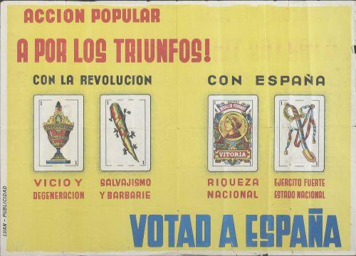 ACCION POPULAR. A POR LOS TRIUNFOS. VOTAD A ESPAÑA. 1935. 70x100cm. (27x40in.). Litografía. B. Erosiones en los pliegues.