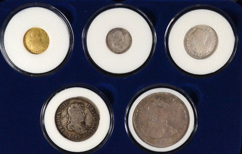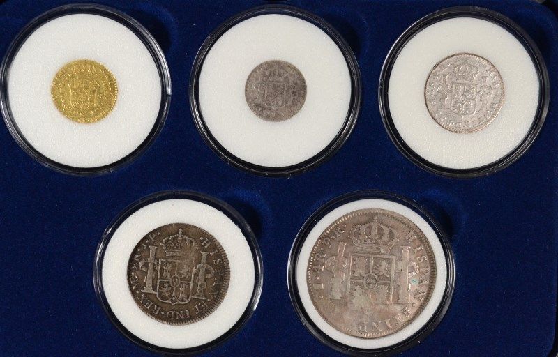 SPANISH COINS TYPE SET: 1799 GOLD 1 ESCUDO, 1780 & 1817 1 REALES,1817 2 REALES &
