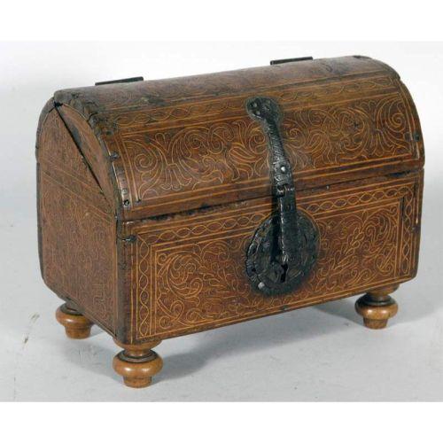 SPANISH COLONIAL BOX, with domed top, 10"x8"x5", later feet, 18th century, PACKING AND SHIPPING: We offer packing (double boxed in most cases) and shipping of this item within the Continental United States by USPS or UPS (our choice- boxes over 30lbs or oversized may be recalculated based on buyer's location), NOT INCLUDING INSURANCE (it will be added when we know the sales price) for $30