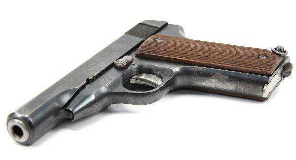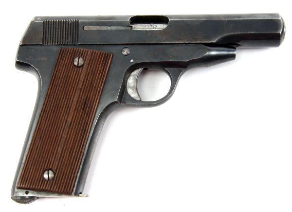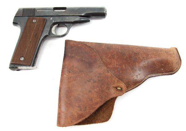 .32 caliber Spanish pistol made by Cooperative Obrera of Eibar, Spain. Marked "CAL 7.65 MODEL AUTOMATIC PISTOL / LONGINES",with Spanish proof marks on back left of frame. Influenced by FN designs, and manufactured during the 1920's. These pistols were widely used in the Spanish Civil War, and on occasion by the Germans in WWII. 4 inch barrel with wood grips, and leather holster that appears original. Bore is in very good condition, with a good shine. Bluing is about 70%, and grips are very good. Holster is intact, with expected wear for the age. Overall very good condition. Caliber: 7.65mm Serial #: 89333
