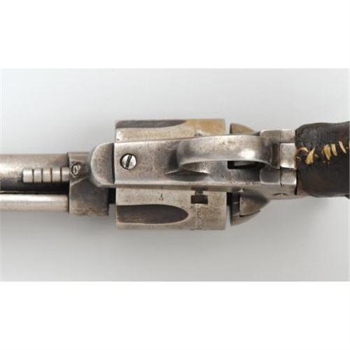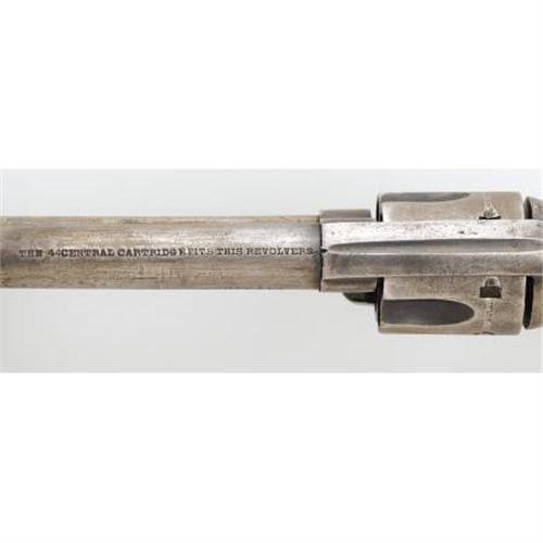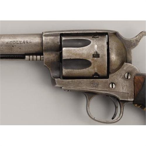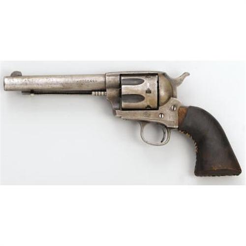 <B>SPANISH COPY OF COLT SINGLE-ACTION REVOLVER</B></I> - No serial number. 5½" barrel in .44 centerfire cartridge. Colt horse logo in circle stamped on left side of frame. Barrel stamped "The 44 Central Cartridge Fits This Revolvers." Left side of barrel stamped "Colt 44." Functioning action. Wood grips are covered with leather. This is a very well-made and excellent example of a Spanish/Mexican copy of a Colt single-action. <BR><BR><B>Condition:</B></I> All metal surfaces are gray with minor pitting at the muzzle.<BR><BR><b>Shipping:</b> Bats, Clubs, Sticks, Swords, Rif (<a target="_blank" href="http://www.heritageauctions.com/common/shipping.php">view shipping information</a>)