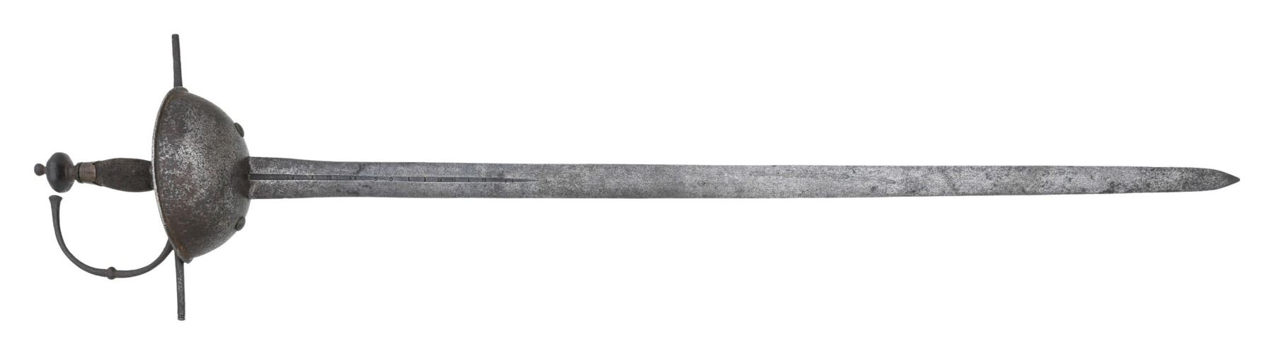 A very nice example of a Spanish colonial cup hilt broadsword of the late 17th or 18th century. The overall length is 40" and the blade length is 32 1/2". The blade has a 9c 1/2" fuller extending from the cup with an inscription, possibly Latin, that reads " + GIO ++ HNEGT ++ " on one side an the opposite side reads " + IN ++ SOLINGEN ++". The cup is about 5 3/4" in diameter and the crossguard measures9 1/2" across. There is an exaggerated knuckle bow with a bulbous pommel and wire wrapped grip. CONDITION: blade has a dark gray mottled patina with staining. The hilt has a similar dark gray patina. The cup is loose and a bit misshaped. PROVENANCE: Estate Collection of Nicholas Apergis. (02-24751/BF). $800-1200.