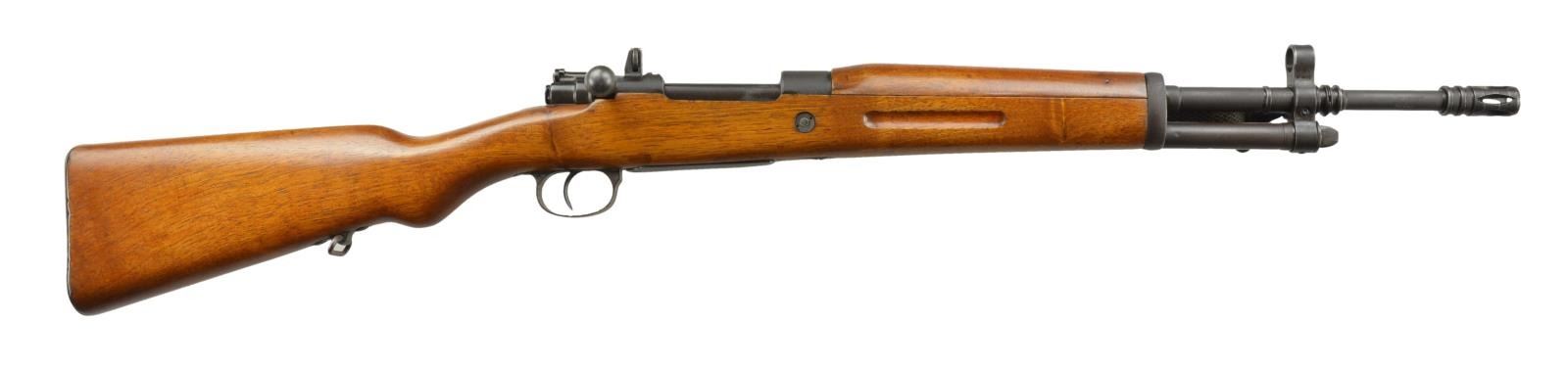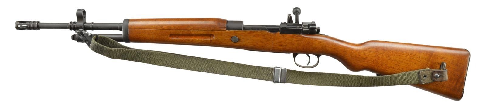 Cal. 7.62 X 51 CETME. S# FR8-45146. Bbl. 19" including flash supressor. Import marked on right side of bbl. Rifles were converted to FR-8 configuration from the Model 1943 short rifle. The rifles were shortened & given a tubular bayonet mt. resembling a gas tube. The shortened bbl. is equipped w/ a CETME type flash supressor. Adj. combination open & aperture rear sight mounted on receiver bridge. Tapered post front sight w/ protective hood. Straight bolt handle. Walnut stock set, side mounted green web sling. CONDITION: stock set has attractive arsenal rework finish w/ scattered handling marks and slight loss of wood in inletted areas. Metal retains 75% arsenal rework finish over wear & scattered fine pitting. Very good shiny bore. (22-683/RW). CURIO. $200-400.