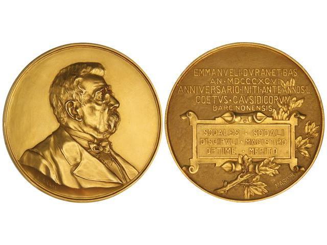 SPANISH MEDALS - Manuel Durán i Blas. 1896. BARCELONA. Anv.: Su busto a derecha. Escultor: E.ARNAU. Rev.: EMMANVELI.DVRAN.ET.BAS/AN.MDCCCXCVI/ANNIVERSARIO.INITI.ANTE.ANNOS.L/COETVS.CAVSIDICORVM/BARCINENSIS, debajo dentro de rectángulo ornamentado SODA