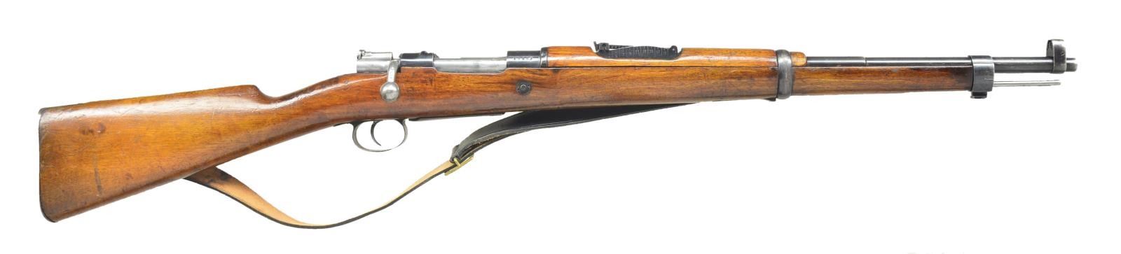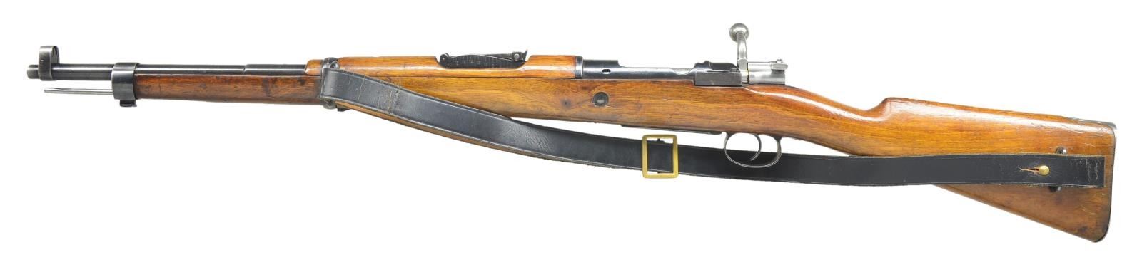 Cal. 308 Win. S #Z9846. All visible S #'s match. Bbl. 22" w/ import marking. Receiver ring marked w/ Falangist crest. Right side of receiver numbered "19463". Left side of receiver marked Spanish proofs and S #. Tangent rear sight graduated to 2000 meters. Inverted V front sight w/ protectors. Cleaning rod present. Left side sling swivels w/ black leather sling. Flat steel buttplate marked "266". Hardwood stock. CONDITION: hardwood stock has finish w/ scattered dings, scratches and handling marks. Metal retains 85% arsenal rework blue with a few spots of light oxidation. scattered thinning, silvering and light scratches. Good bore with a couple patches of frosting. (22-2463/MJC). CURIO. $300-400.