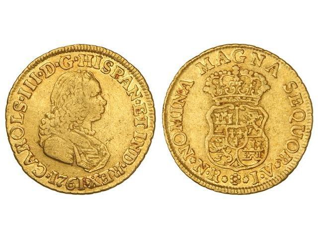 SPANISH MONARCHY: CHARLES III - 2 Escudos. 1761. NUEVO REINO. J.V. (Ha estado en aro). RARA. Cal-535. MBC-.