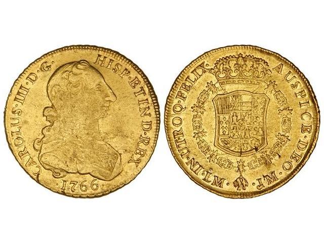 SPANISH MONARCHY: CHARLES III - 8 Escudos. 1766. LIMA. J.M. Restos de brillo original. (Acuñación floja en centro del anverso. Golpecitos en canto y pequeña grieta en canto). MUY RARA. Cal-14; XC-680. MBC+.