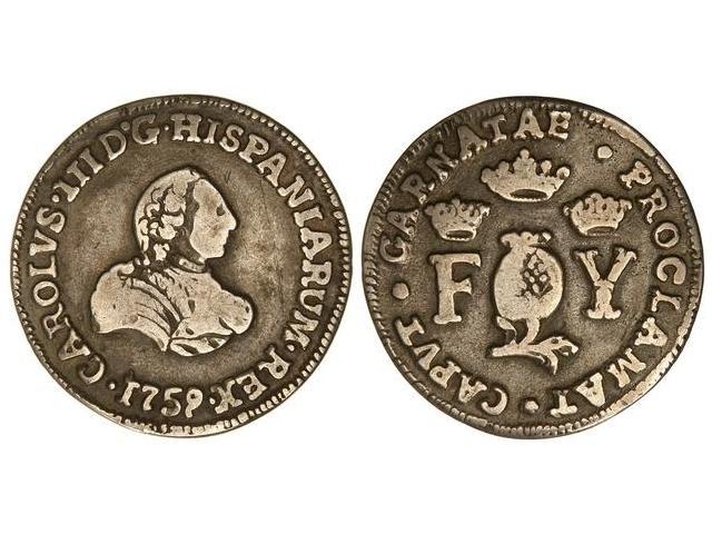 SPANISH MONARCHY: CHARLES III - Medalla Proclamación. Módulo 4 Reales. 1759. GRANADA. AR fundida. Ø 32 mm. RARA. He-17. MBC-.