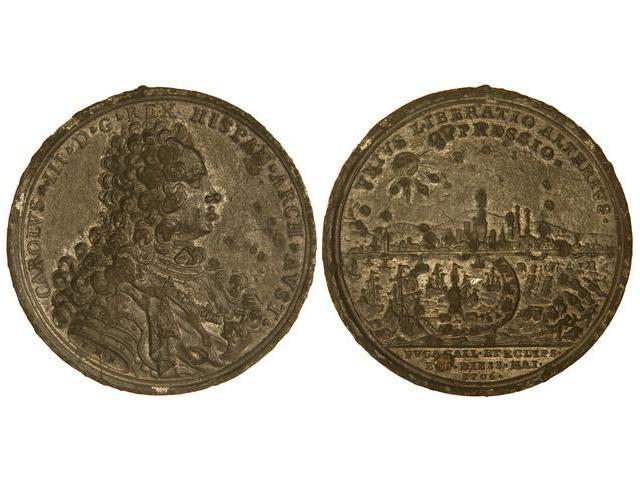SPANISH MONARCHY: CHARLES III Pretender - Levantamiento del Sitio de Barcelona. 1706. Anv.: Busto a derecha. Rev.: Vista de la ciudad y el puerto, con sol eclipsado y la flota llegando a su socorro y los sitiadores abandonando el campo. Calamina. Ø 44 mm. (Pequeñas oxidaciones). VQ-