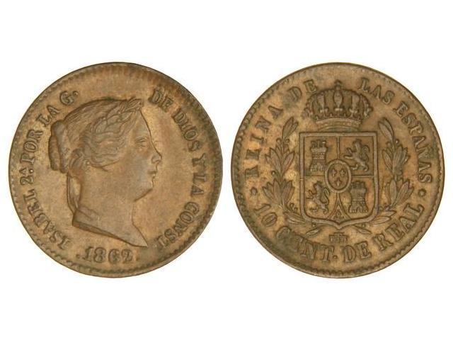 SPANISH MONARCHY: ELISABETH II - 10 Cénitmos de Real. 1862. SEGOVIA. Cal-608. EBC.