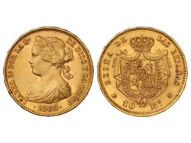 SPANISH MONARCHY: ELISABETH II - 10 Escudos. 1868 (*18-68). MADRID. (Golpecito en gráfila). Cal-47. EBC.