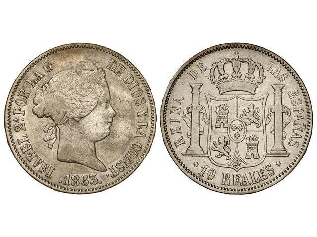 SPANISH MONARCHY: ELISABETH II - 10 Reales. 1863. MADRID. (Rayitas). Cal-232. MBC.