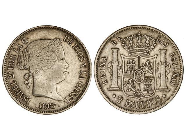 SPANISH MONARCHY: ELISABETH II - 2 Escudos. 1867. MADRID. (Manchitas). Cal-204. MBC.