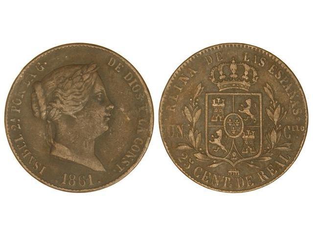 SPANISH MONARCHY: ELISABETH II - 25 Céntimos de Real. 1861. SEGOVIA. Cal-596. MBC.