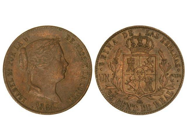 SPANISH MONARCHY: ELISABETH II - 25 Céntimos de Real. 1864. SEGOVIA. Cal-599. EBC-.