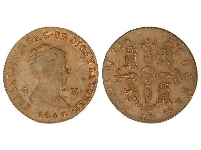 SPANISH MONARCHY: ELISABETH II - 4 Maravedís. 1847. JUBIA. Restos de brillo original. (Rotura de cuño en reverso). Cal-517. EBC.