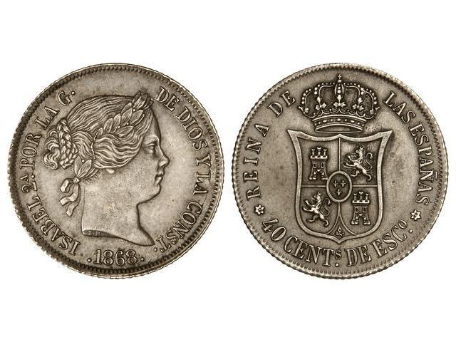 SPANISH MONARCHY: ELISABETH II - 40 Céntimos de Escudo. 1868 (*18-68). MADRID. Pátina. (Rayita y pequeño sobrante de metal en anverso). Cal-340. EBC/EBC-.