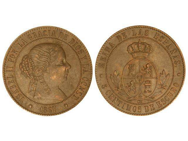 SPANISH MONARCHY: ELISABETH II - 5 Céntimos de Escudo. 1867. BARCELONA. O.M. Cal-624. EBC+.