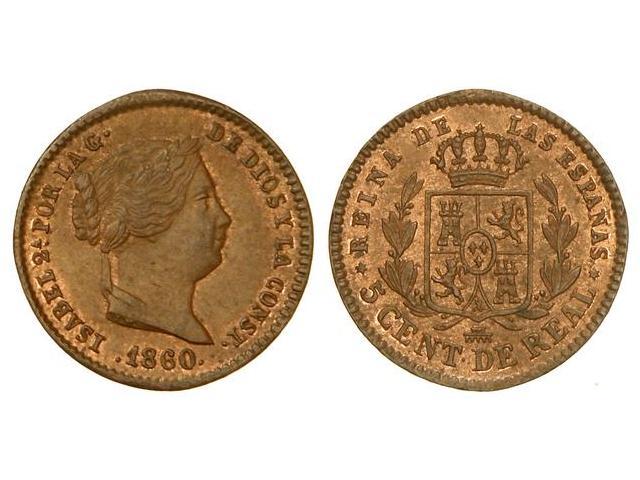 SPANISH MONARCHY: ELISABETH II - 5 Céntimos de Real. 1860. SEGOVIA. Pátina y color original. Cal-617. EBC+.