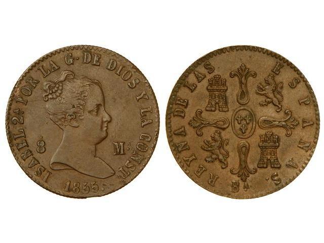 SPANISH MONARCHY: ELISABETH II - 8 Maravedís. 1855. BARCELONA. (Pequeños defectos de acuñación en canto). Cal-470. MBC+/EBC-.