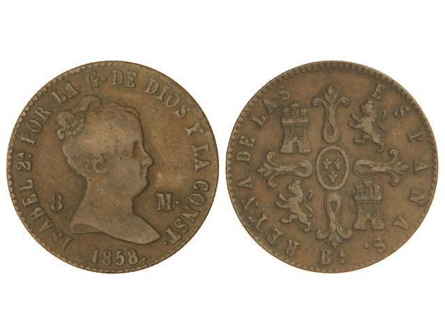 SPANISH MONARCHY: ELISABETH II - 8 Maravedís. 1858. BARCELONA. Cal-471. MBC.