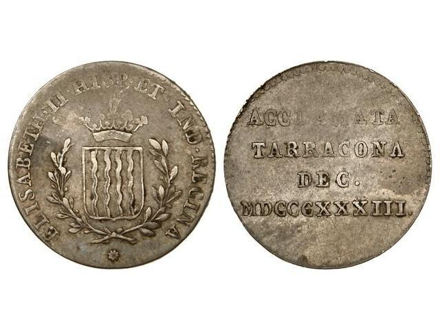 SPANISH MONARCHY: ELISABETH II - Medalla Proclamación. 1833. TARRAGONA. AR. Ø 21 mm. He-33. MBC.