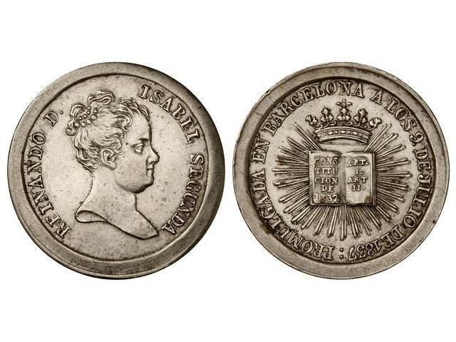 SPANISH MONARCHY: ELISABETH II - Medalla Promulgación de la Constitución. 9 Julio 1837. BARCELONA. AR. Ø 23 mm. (Leve golpecito en gráfila). V.Q.-14269. EBC.