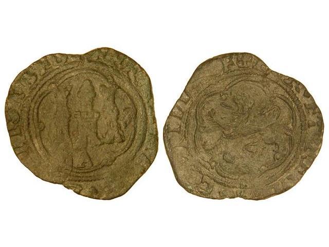 SPANISH MONARCHY: FERDINAND AND ISABELLA - 4 Maravedís. CORUÑA. Anv.: Castillo, a derecha ¿venera?, debajo A. Rev.: León rampante, entre las patas venera. Cal-¿541 var.?. (MBC).