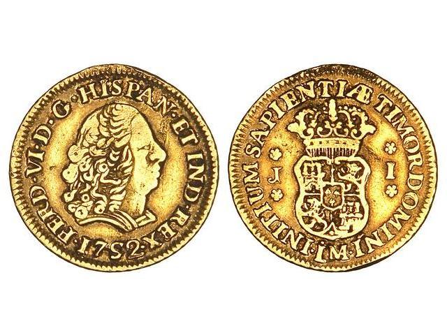 SPANISH MONARCHY: FERDINAND VI - 1 Escudo. 1752. J. LIMA. J. (Pequeño golpecito en canto). MUY RARA. Cal-203. MBC-.