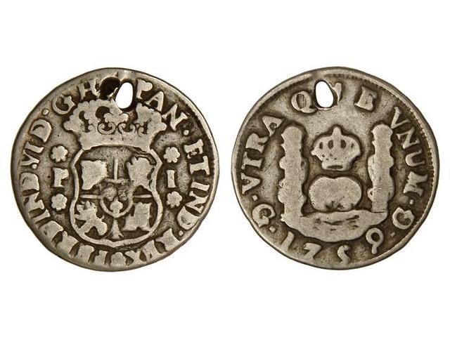 SPANISH MONARCHY: FERDINAND VI - 1 Real. 1759. GUATEMALA. P. Columnario. (Perforación). RARA. Cal-539. BC+.
