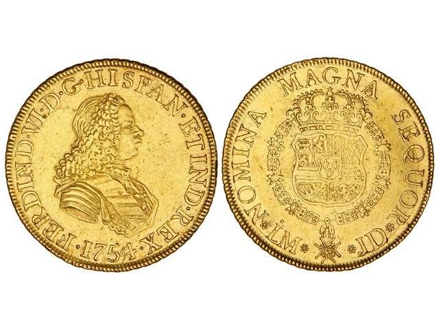 SPANISH MONARCHY: FERDINAND VI - 8 Escudos. 1754. LIMA. J.D. (Rayitas). RARA. Cal-21; XC-581. MBC+.