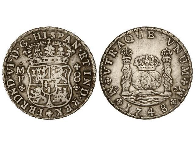 SPANISH MONARCHY: FERDINAND VI - 8 Reales. 1748. MÉXICO. M.F. Columnario. (Raya de ajuste en reverso). Cal-323. MBC/MBC+.