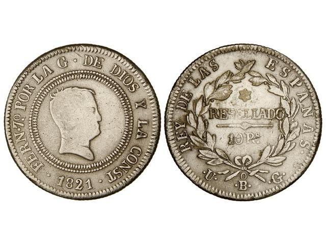 SPANISH MONARCHY: FERDINAND VII - 10 Reales. 1821. BILBAO. U.G. Módulo 4 Reales. Resellada. Cal-702. MBC-.